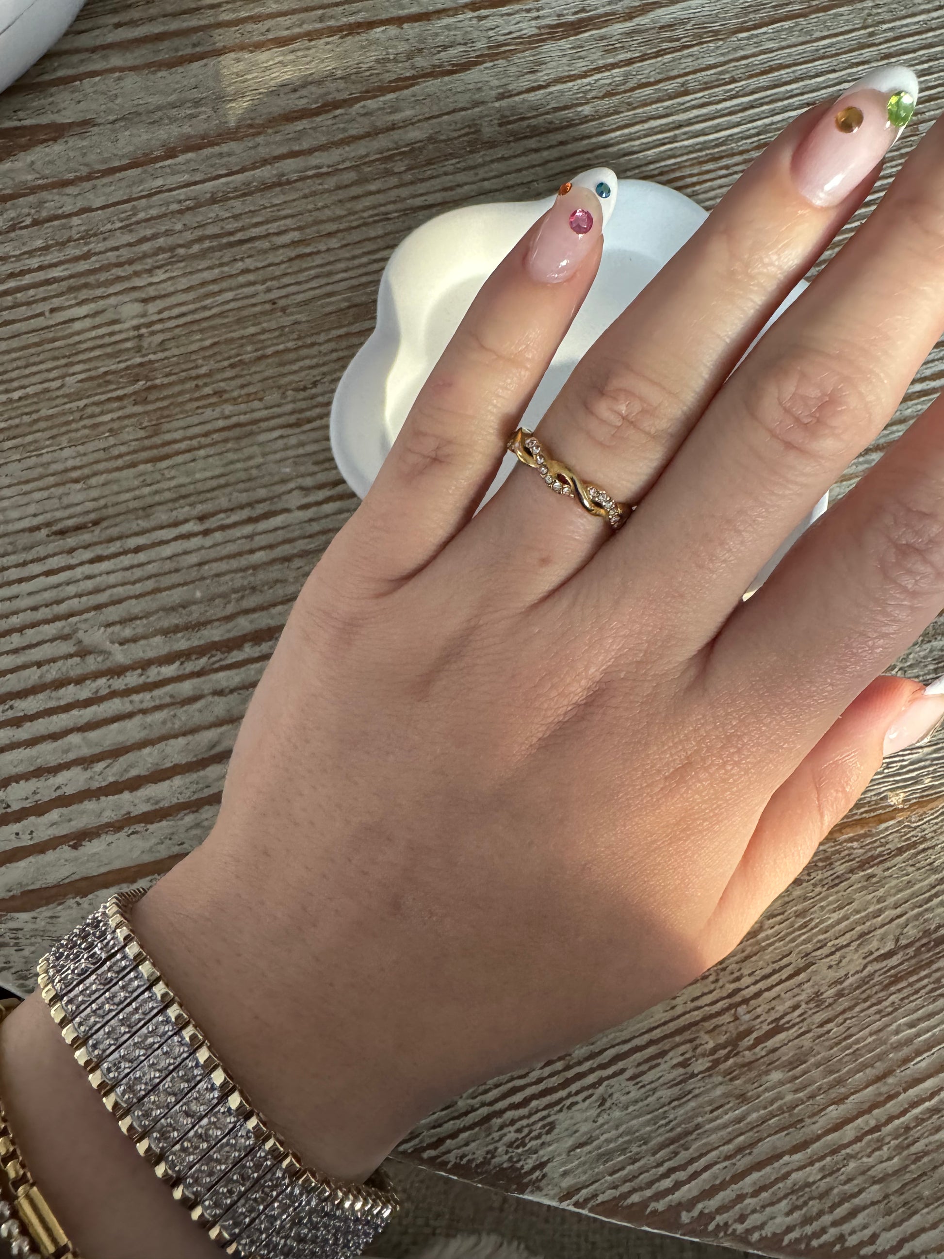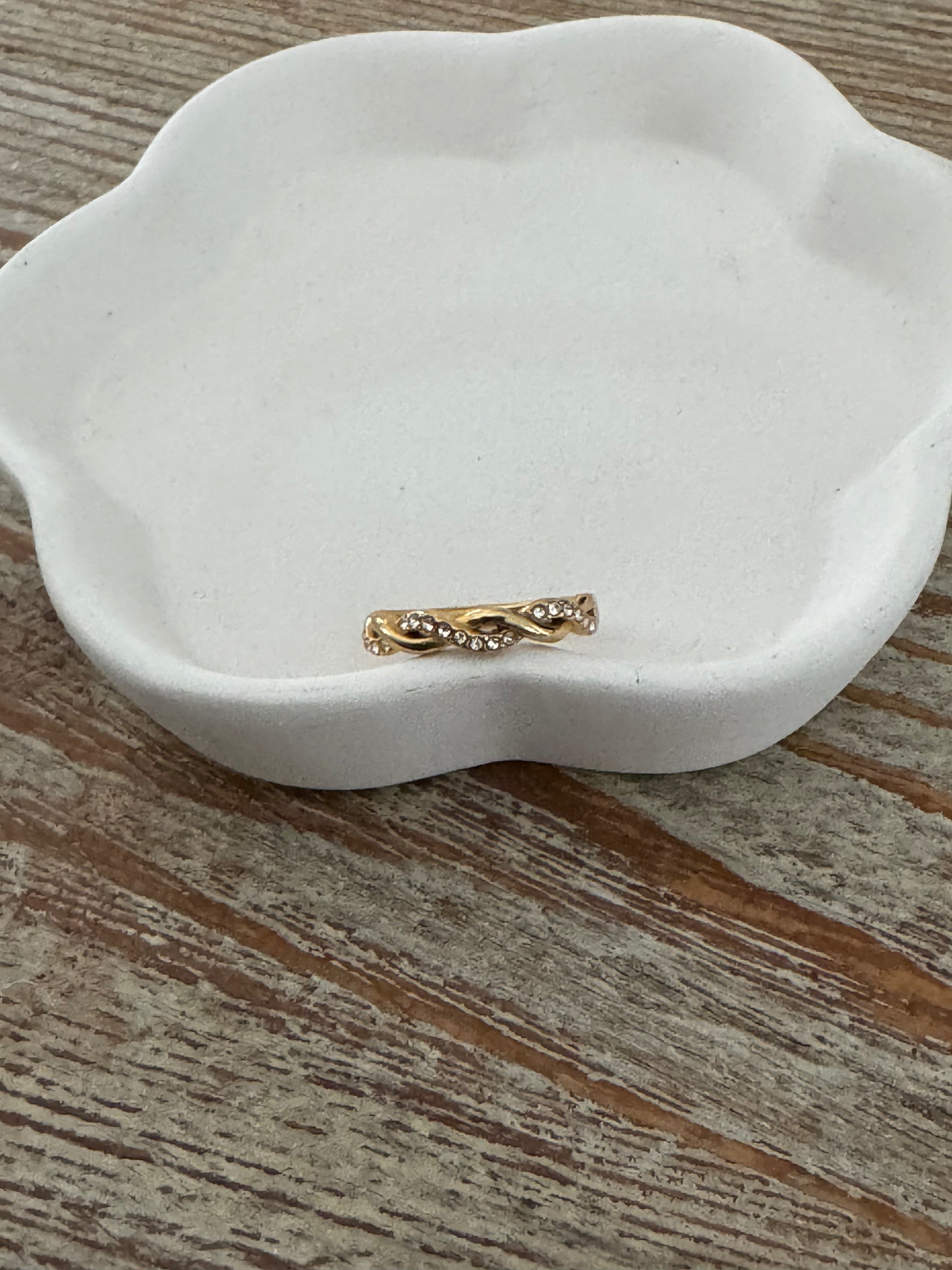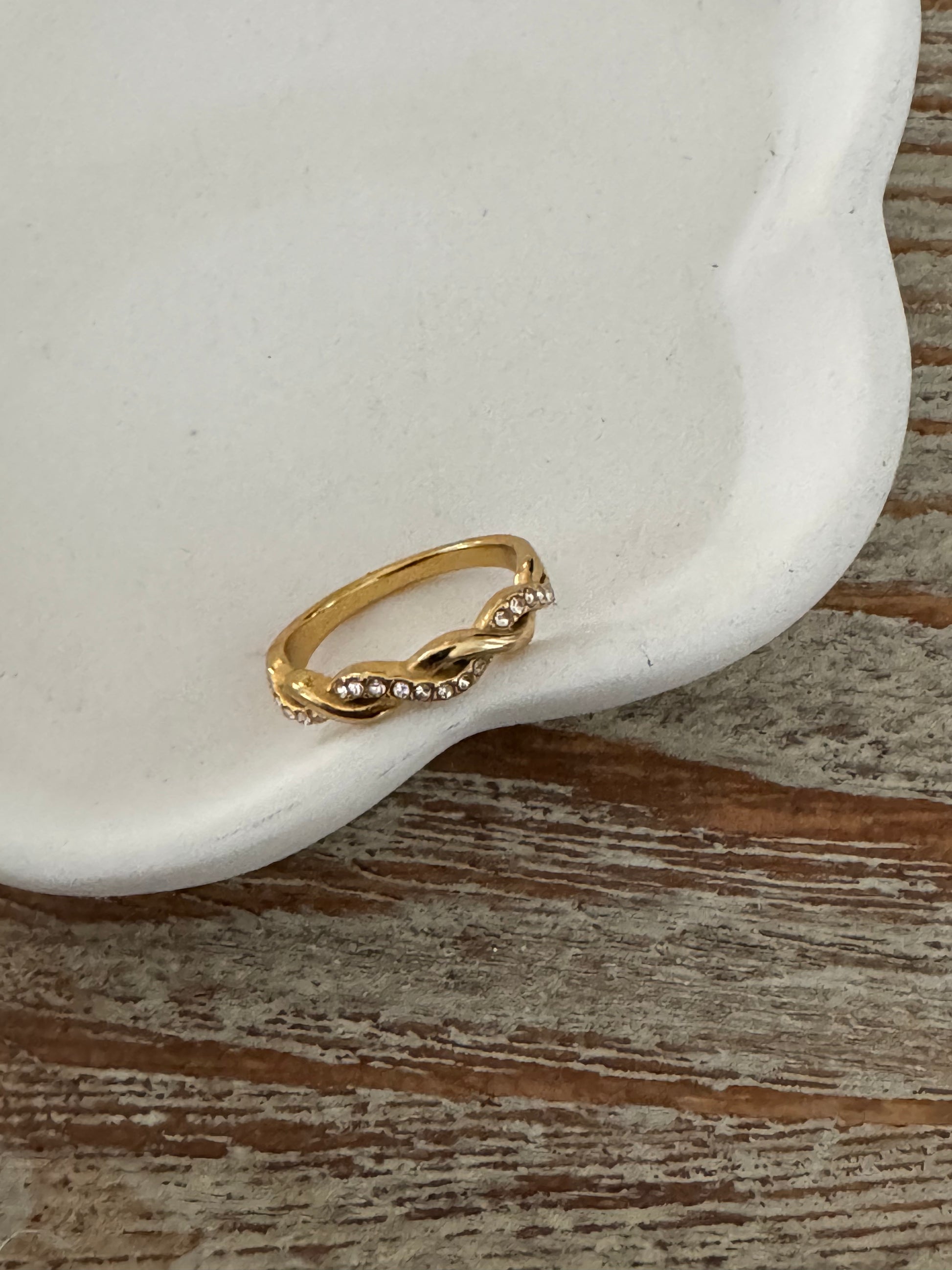Our braid band is our newest dainty ring featuring a braided design with solid gold and crystals! Perfect stacking pieces.